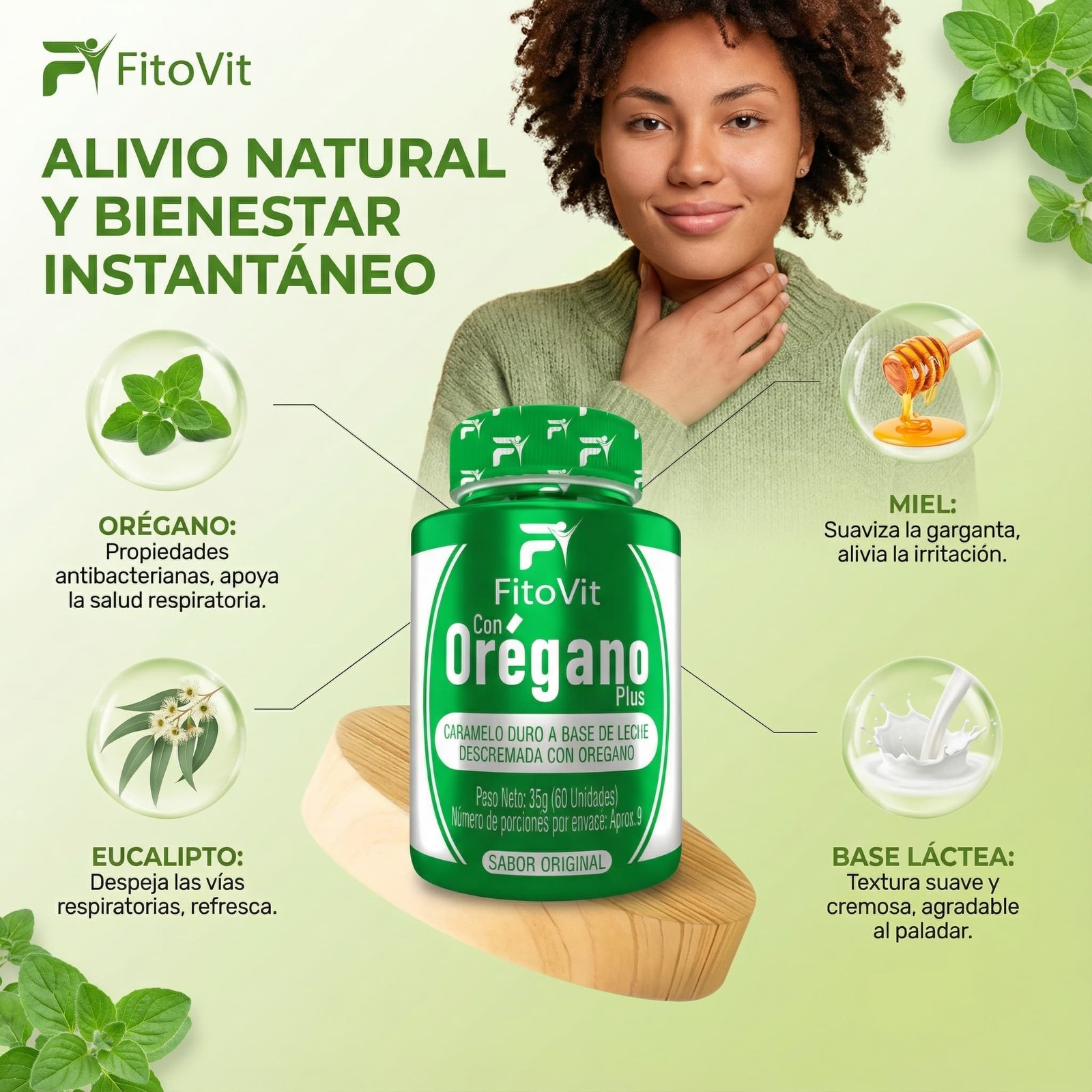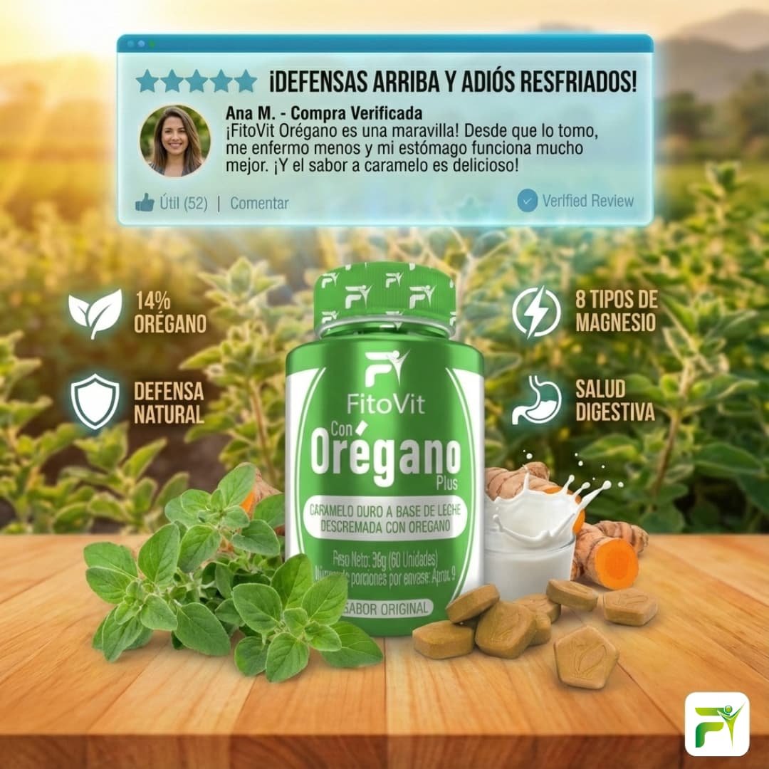 Cuida tu garganta y respira mejor con Orégano Plus Fitovit, deliciosos caramelos funcionales elaborados con leche descremada y extracto natural de orégano. Su fórmula combina un sabor agradable con beneficios naturales que ayudan a aliviar la garganta, refrescar la respiración y apoyar el sistema respiratorio.