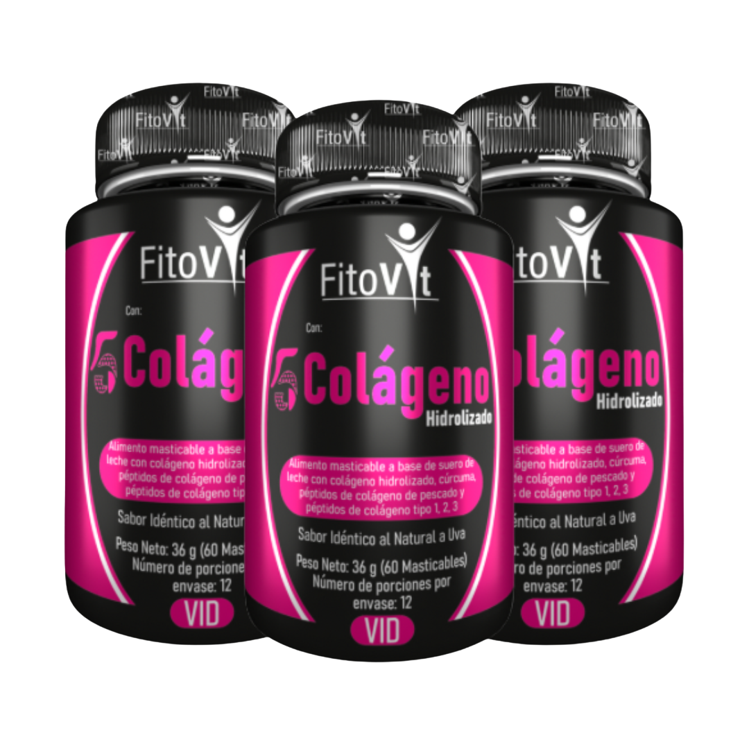 Lleva tu rutina de bienestar al siguiente nivel con el combo de 3 unidades de 5 Colágenos Fitovit, una fórmula avanzada con colágeno hidrolizado tipo 1, 2 y 3 en tabletas masticables sabor uva. Ideal para mantener un consumo constante y potenciar resultados visibles en tu piel, cabello, uñas y articulaciones.